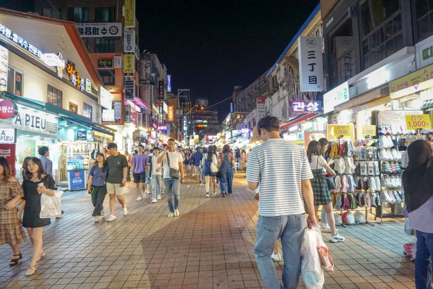 9. To help avoid jet lag, stay awake until bedtime in your new place — and get outside as much as possible. Check! After dinner, we went for a walk around the Hongdae neighborhood of Seoul. Hongdae is home to Honggik University, a leading fine arts college in South Korea. The neighborhood has many shops, street vendors, and young people. It was fun to look around, stroll amidst the vibrant people, and fight the urge to sleep.